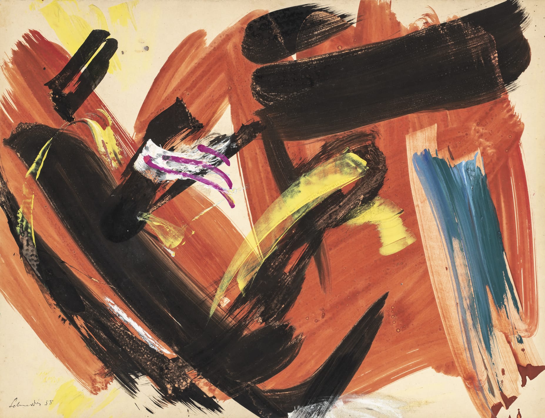 Sans titre, 1958. Œuvre sur papier de Gérard Schneider réalisée à la gouache et à l’encre, caractéristique de l’abstraction lyrique de l’artiste. Format 50 × 65 cm. L’œuvre est signée et datée en bas à gauche.